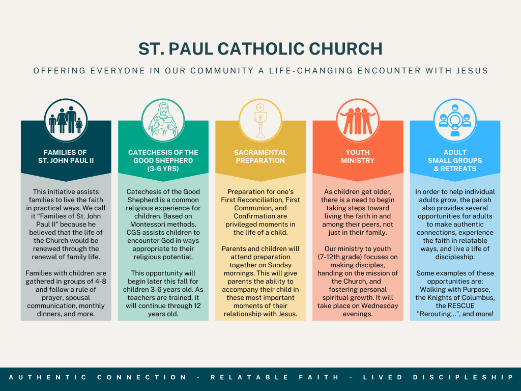 We’ll have something called Catechesis of the Good Shepherd, which is for 3-6 year olds. We’ll have preparation for First Communion and Confirmation, and we’ll do that on Sunday mornings between the Masses, and parents will participate with their child. As they get older, kids need to learn to live their faith among their peers, so we’ll have youth group opportunities for older kids on Wednesday evenings. Opportunities for men and women to grow individually, like Walking with Purpose, retreats like “the RESCUE,” or small groups like, “Rerouting…” So there are many, many ways for people to be involved.Yes, the loss of PSR can seem like a defeat. But it’s not. I promise you it’s not. We’re making a proposal. And the proposal is that the Eucharist and the family life be given priority. If parents want to bring 110 kids to something for one hour a week, the best thing they can bring them to is the Sunday Eucharist—and that as a family. Because that’s where the renewal of our parish, of our town, of our world will flow from.