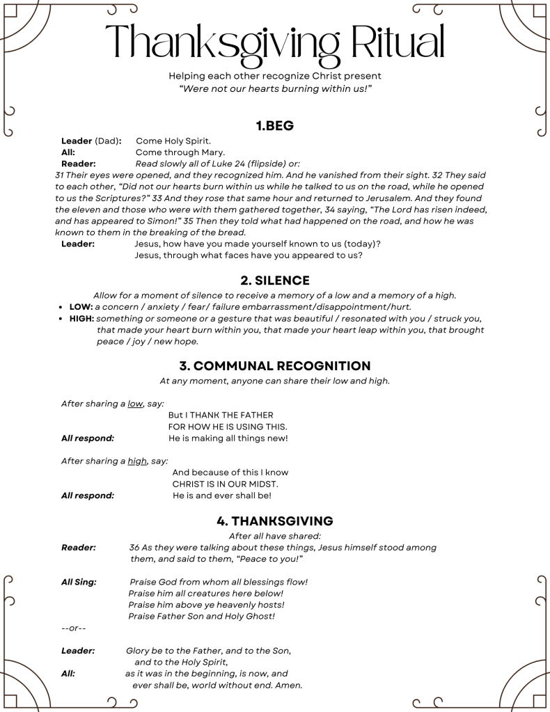 So just look with me real quick. I just want to go through it, but then give some examples. This whole ritual focuses on the 24th chapter of Luke’s Gospel. What happens in chapter 24? Jesus rises from the dead, yeah. But in the center of the chapter is the very famous account of the two disciples walking to the nearby village of Emmaus. And how there, on the way, Jesus begins to walk with them. But? But they do not recognize him. It is only later that they recognize him. And when they do recognize him, what happens? IT CHANGES THEM! And they share this with each other, and then run back to Jerusalem to tell everyone! Ok, this story is archetype of what we’re doing here. Why? Because day after day, we are making our journey through life. And just like these disciples, we’re on the journey together. And just like this story, Jesus is present and real and walking with us—but we don’t recognize him right away. And so we beg, we ask for the grace to recognize Jesus’ presence, to have our eyes opened and to recognize him present. And so one other thing: this prayer is best done with others; one, two, three others; you and your family.