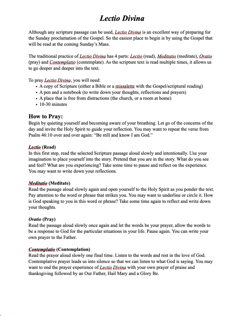 Now, I know what you’re thinking: “What does this have to do with the Bible?? I thought we were taking a deeper dive into the Bible!” If we are going to allow Jesus Christ to teach us, to shape us, to form us—in particular, if we’re going to allow Jesus to change the stories that we believe—like I said, we need to fill our minds with His teachings, the truths He reveals to us. And there are a lot of ways this happens: through the teachings of the Church, through the preaching you hear at Mass, through reading good books on theology, good podcasts. But one thing that I would encourage is an ancient practice called Lectio Divina. Lectio Divina is just Latin for “Divine Reading,” and it’s the name of a practice of reading and praying with Scripture, with the Bible. And I’ve left some nice guides out beneath the TV, and we’ll talk about this more.